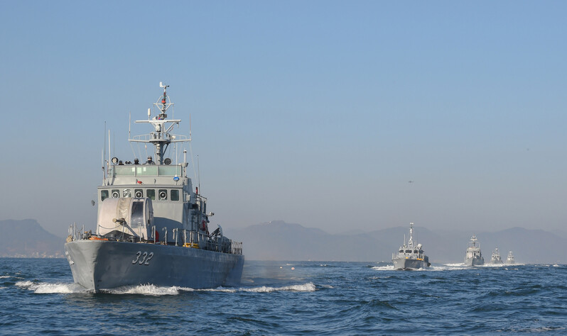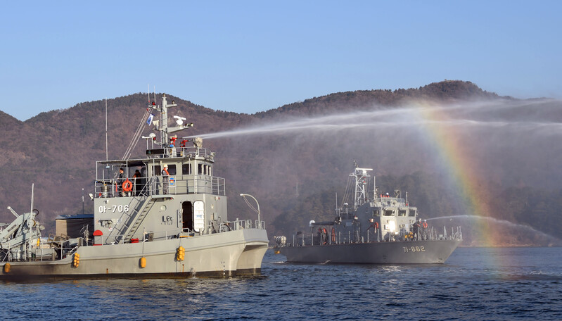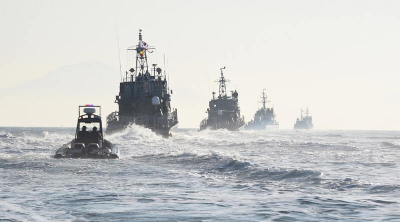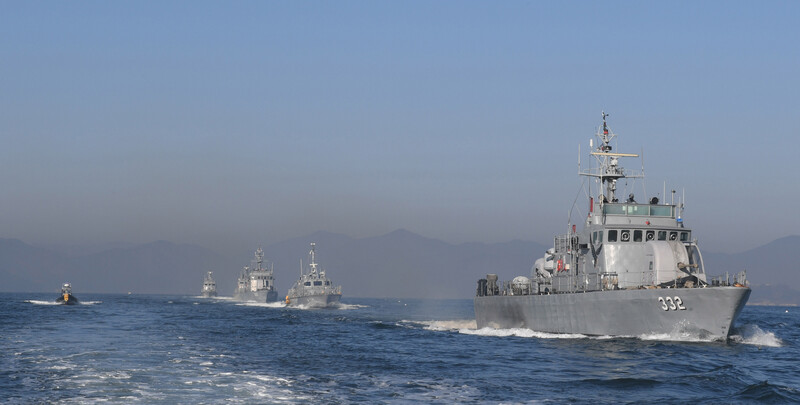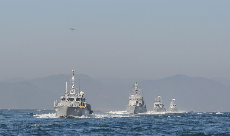 These photos, provided by the Navy, show this year's first drill by the port protection fleet, conducted on seas off the naval base in Jinhae, 312 kilometers southeast of Seoul, on Jan. 12, 2023. (PHOTO NOT FOR SALE) (Yonhap)