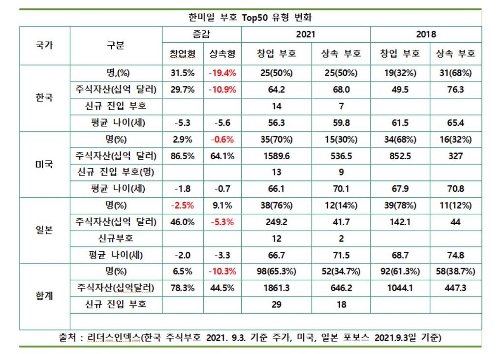 창업 부호들의 평균 나이 변화를 보면 미국은 67.9세에서 66.1세로, 일본은 68.7세에서 66.7세로 낮아졌다. 한국은 61.5세에서 56.3세로 대폭 낮아져 부의 세대교체가 한국에서 빠르게 일어나고 있음을 보여준다고 리더스인덱스는 설명했다.