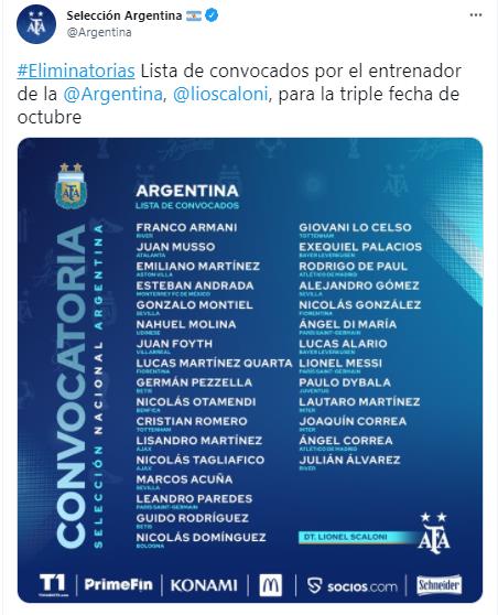 아르헨티나축구협회는 28일(한국시간) 홈페이지를 통해 10월에 치러지는 3차례 카타르 월드컵 남미예선에 나설 30명의 대표팀 명단을 발표했다.