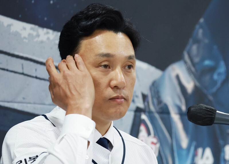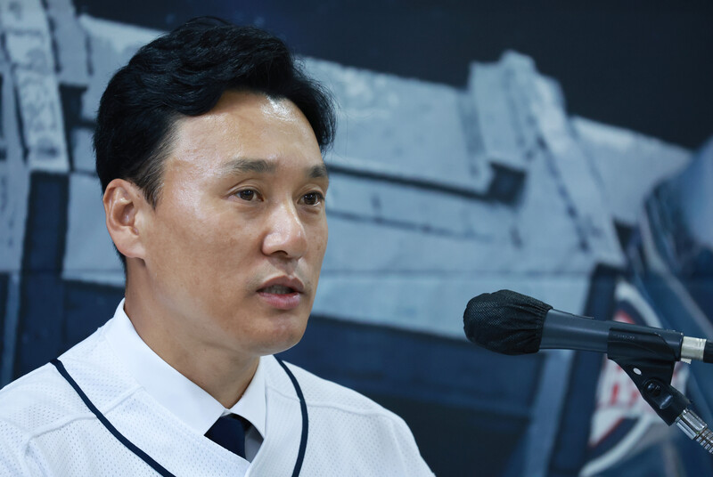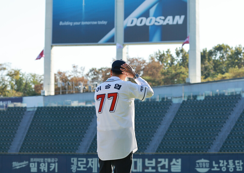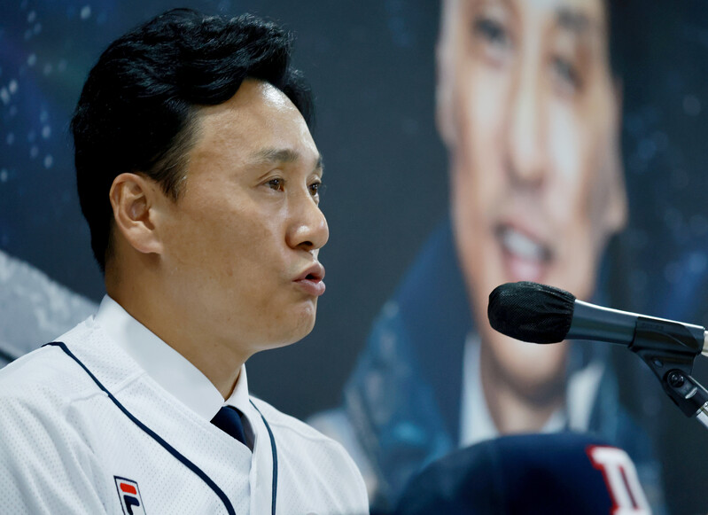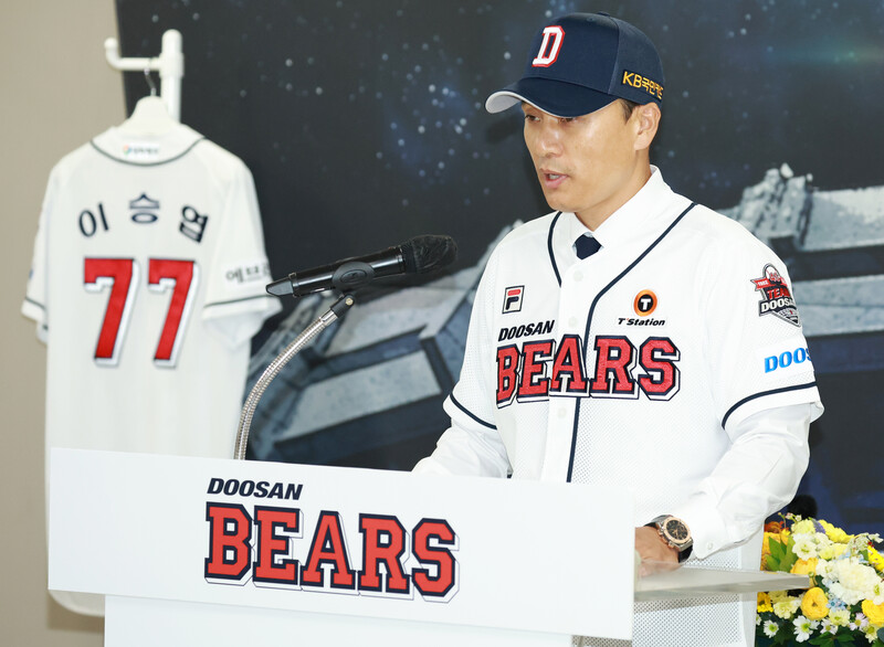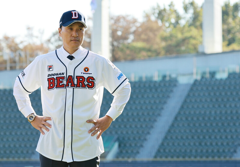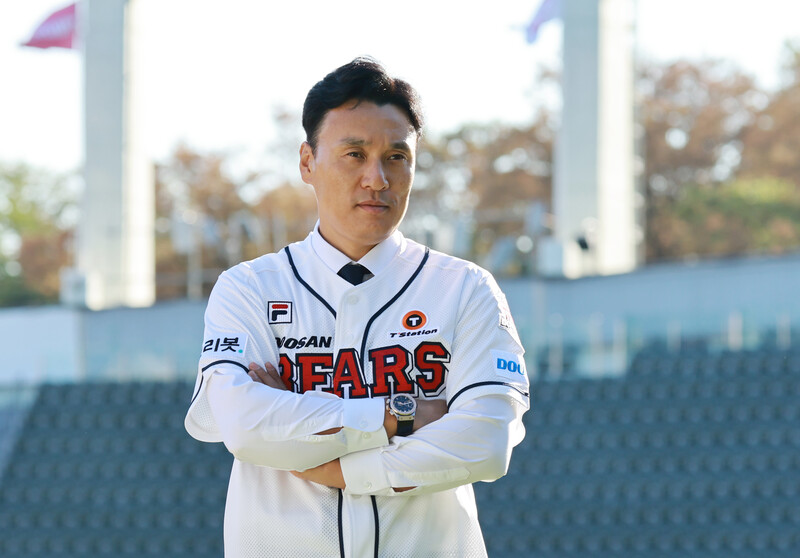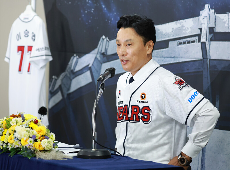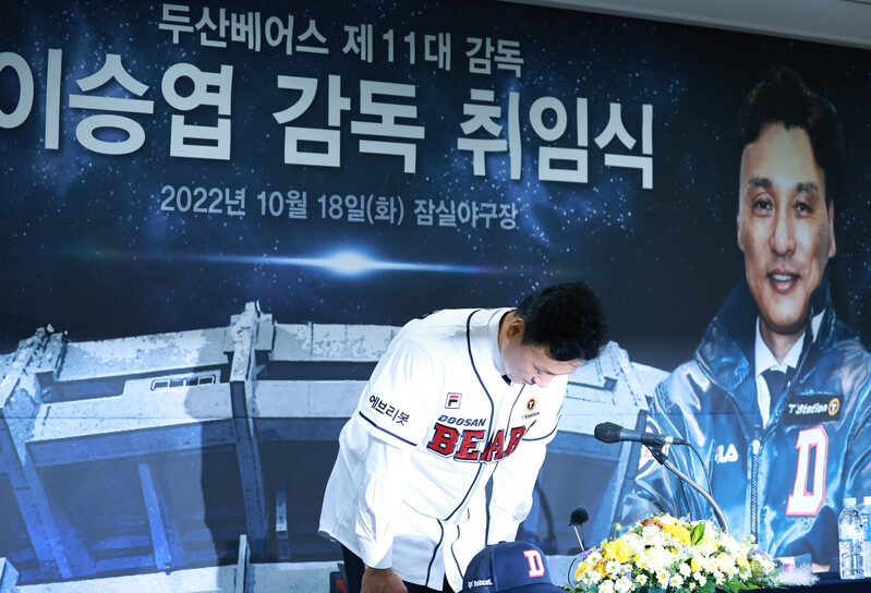 New Doosan Bears manager Lee Seung-yuop has his introductory press conference and poses for a photo in Seoul on Oct. 18, 2022. The Seoul-based Korea Baseball Organization club signed Lee, the all-time home run king in South Korean baseball, to a three-year deal worth 1.8 billion won (US$1.27 million) on Oct. 14. (Yonhap)