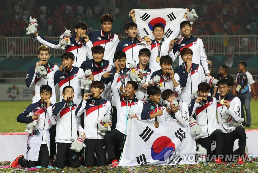 | ▲ 한국축구, 금 사냥 성공 (치비농[인도네시아]=연합뉴스) 신준희 기자 = 1일 오후(현지시간) 인도네시아 자와바랏주 보고르 치비농의 파칸사리 스타디움에서 열린 2018 자카르타·팔렘방 아시안게임 남자축구 결승전 한국과 일본의 경기가 한국의 2대1 승리로 끝났다. 시상식에서 한국 선수들이 승리를 자축하고 있다. 2018.9.2 hama@yna.co.kr |