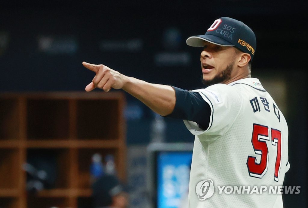 | ▲ 위기에 돌아온 '에이스' 미란다 (서울=연합뉴스) 홍해인 기자 = 17일 오후 서울 구로구 고척스카이돔에서 열린 2021 프로야구 포스트시즌 한국시리즈(KS) 3차전 kt wiz와 두산 베어스의 경기. 1회초 두산 선발 투수 아리엘 미란다가 1사 주자 1루에 강백호를 병살로 잡아내며 이닝을 종료한 뒤 팀 동료를 가리키고 있다. 2021.11.17 hihong@yna.co.kr |