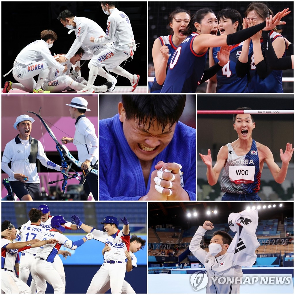 | ▲ [올림픽] 환호의 순간들 (도쿄=연합뉴스) 특별취재단 = 희망이었고 기쁨이었다. 코로나19 팬데믹 상황에 무관중 경기로 치러진 2020도쿄올림픽이지만 태극전사들의 열정과 도전은 그 어느 올림픽보다 치열했다. 그 치열함 끝에 얻어낸 값진 승리는 팬데믹 상황에 힘들어하는 국민들에게 희망이 되고 위안이 되었다. 한국 선수들의 땀과 눈물이 이뤄낸 환호의 모습을 모았다. 남자 에페 단체전 동메달(위 왼쪽부터 시계방향으로), 여자배구 터키전 승리, 높이뛰기 우상혁, 도마 신재환 금메달 획득, 야구 도미니카전 역전 끝내기, 양궁 혼성 안산ㆍ김제덕의 금메달. 가운데는 유도 은메달의 조구함. 2021.8.5 photo@yna.co.kr |
