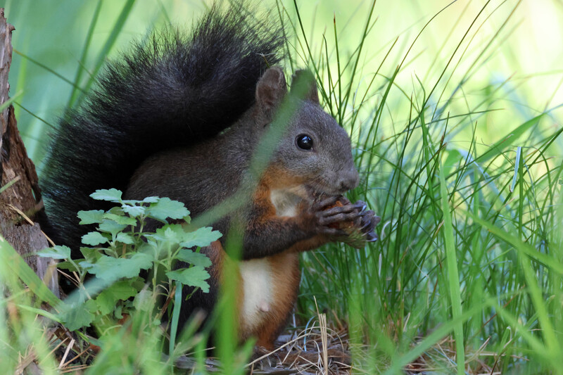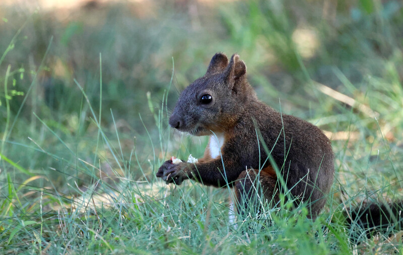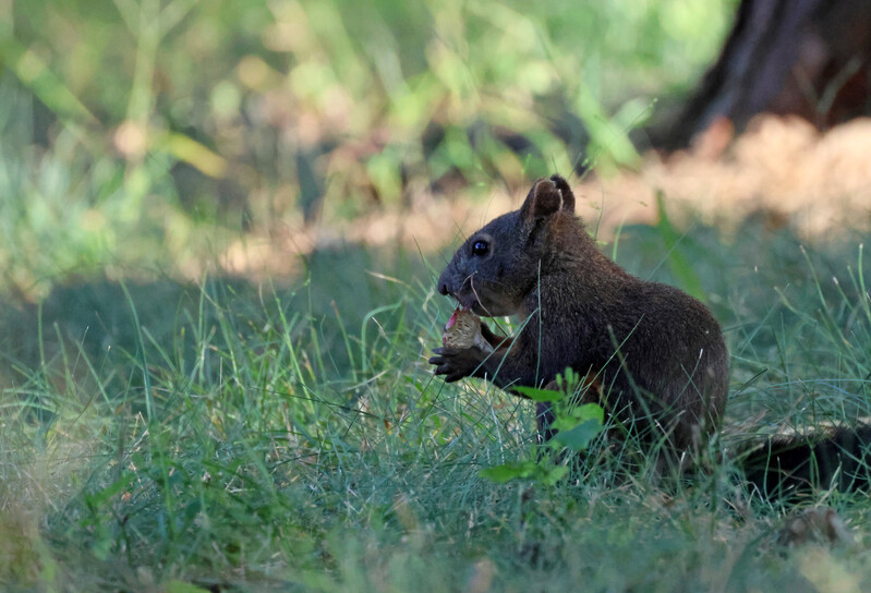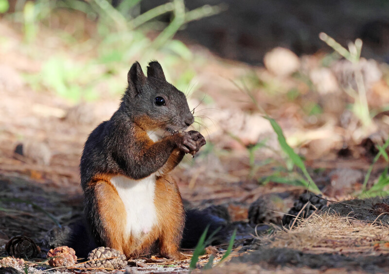 A red squirrel eats in a pine forest in Chodang-dong, Gangneung-si, Gangwon-do.