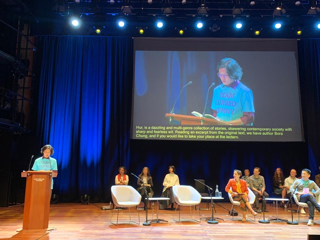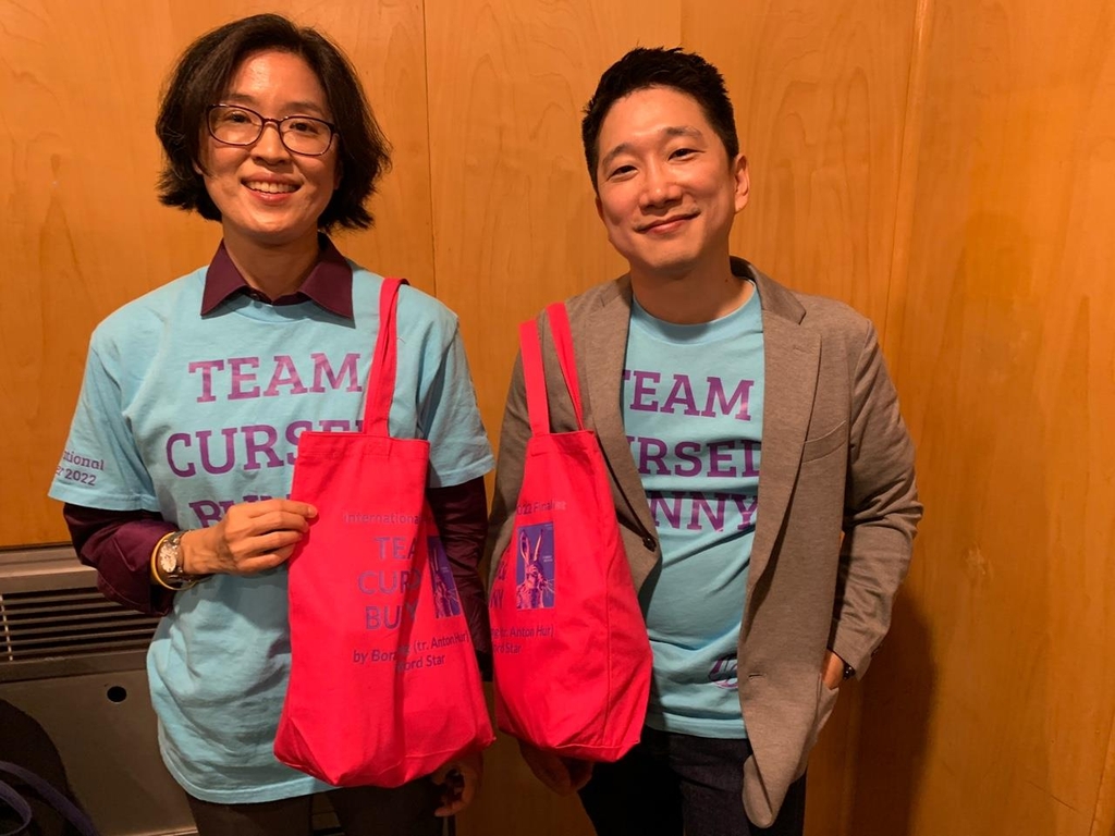 정보라 작가와 안톤 허(허정범) 번역가는 영어판 책 표지에 쓰인 하늘색과 보라색이 들어가고 영어로 '저주토끼팀'(Team Cursed Bunny)이라고 적힌 티셔츠를 맞춰 입고 첫 순서로 나섰다.