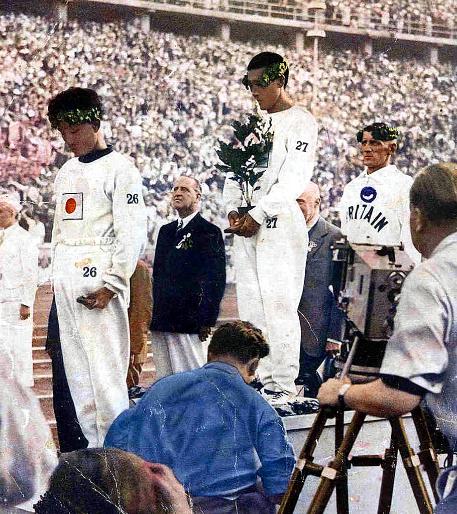 | ▲ 베를린 올림픽 마라톤에서 금메달을 딴 손기정(중앙) 선수와 동메달리스트 남승용(왼쪽) 선수가 시상대에 올라 고개를 숙이고 있다. 이들은 가슴에 단 일장기 때문에 고개를 들 수 없었다고 생전에 회고했다. 1936년 [연합뉴스 자료사진] |