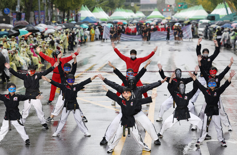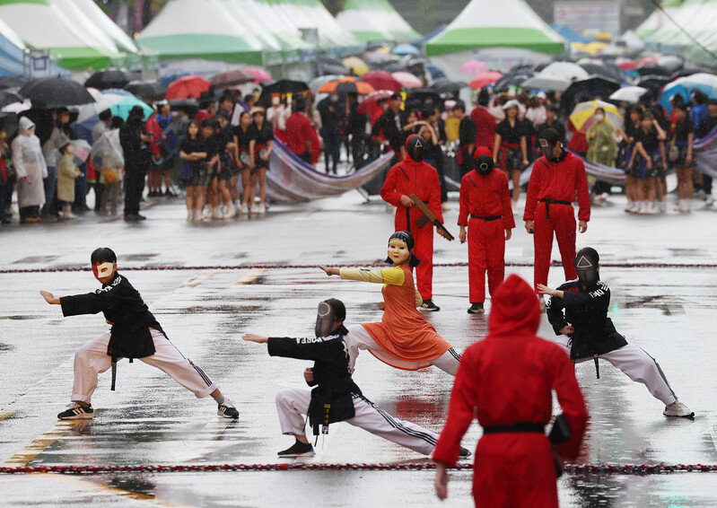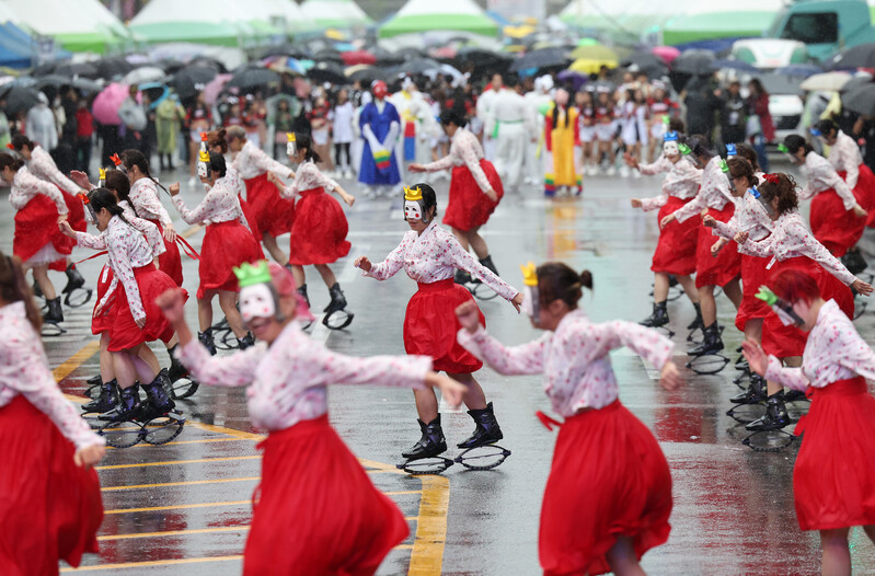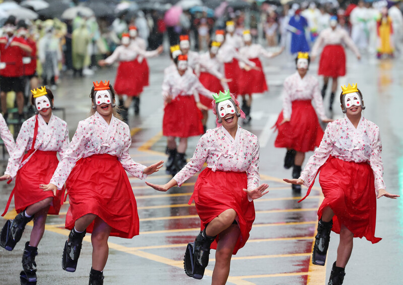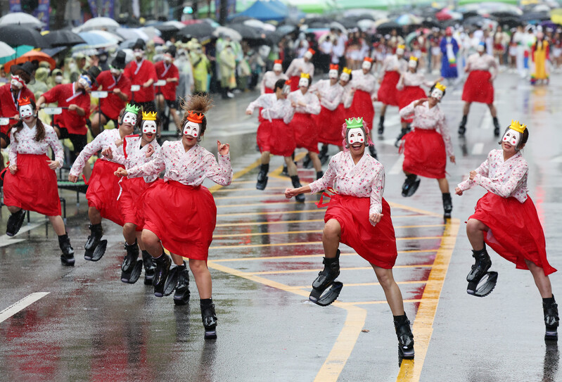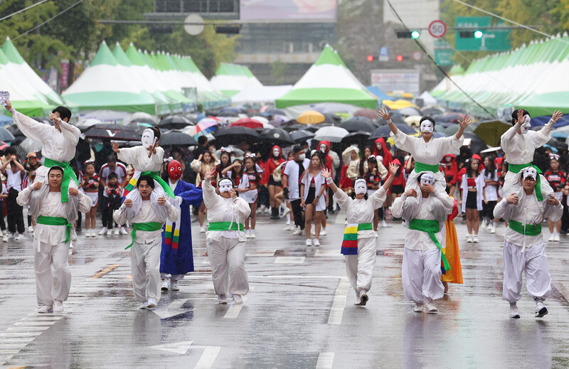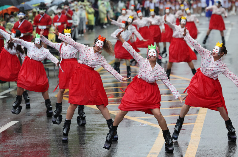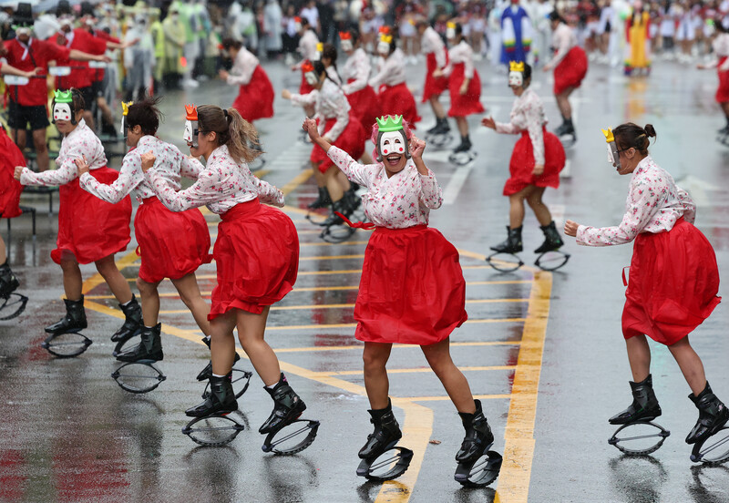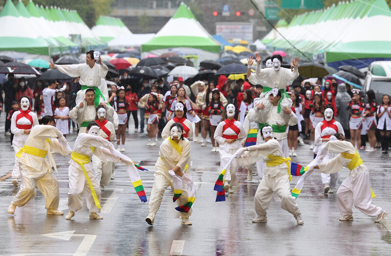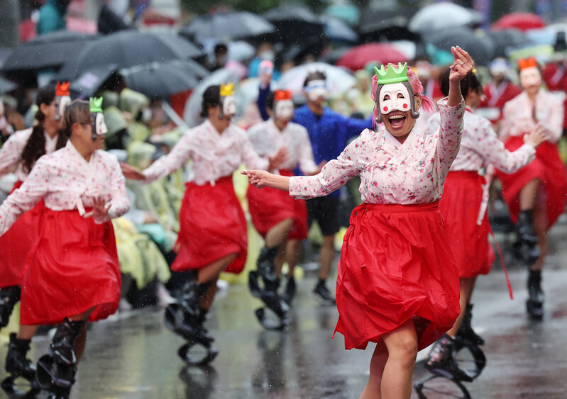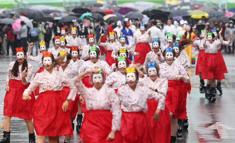 A team participating in the 2022 Nowon Mask Festival Parade held in Nohae-ro, Nowon-gu, Seoul, on the 9th is performing wearing a mask.