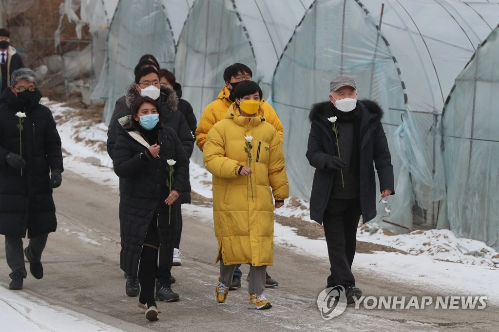 | ▲ 이주노동자 사망 현장 방문한 류호정 의원 (포천=연합뉴스) 임병식 기자 = 정의당 류호정 의원(가운데)이 1월 12일 경기도 포천시에서 발생한 이주노동자 비닐하우스 숙소 사망 사고 현장을 찾아 농장을 둘러보고 있다. 농장에서 채소 재배 등의 일을 하는 캄보디아인 근로자 A씨는 지난 달 20일 숙소용 비닐하우스 구조물 안에서 숨진 채 발견됐다. 당시 포천 지역은 영하 20도까지 떨어지면서 한파특보가 발효됐다. 부검결과 사인은 간경화인 것으로 파악됐으나, 이주노동자의 주거 개선 요구 목소리가 커지고 있다. [연합뉴스 자료 사진. DB 및 재배포 금지] |