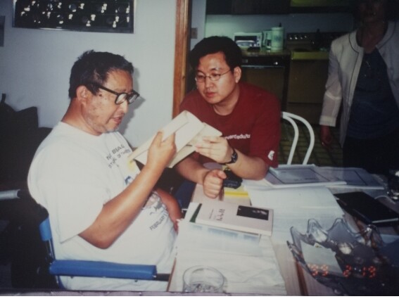 | ▲ Paik Nam-june at his New York home, discussing 'The Tiger is Alive' with the author (right). Photo courtesy of hte author. |