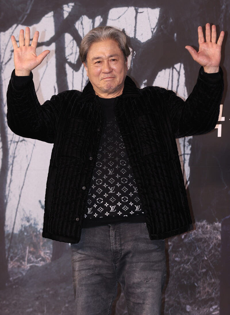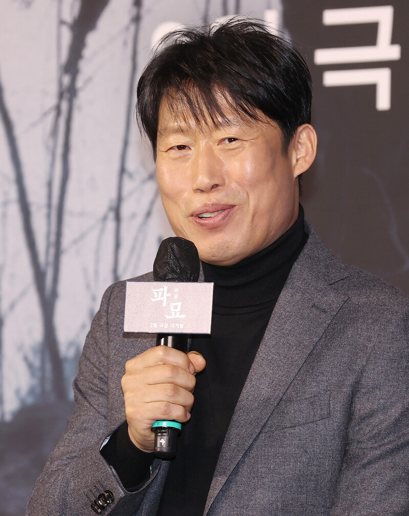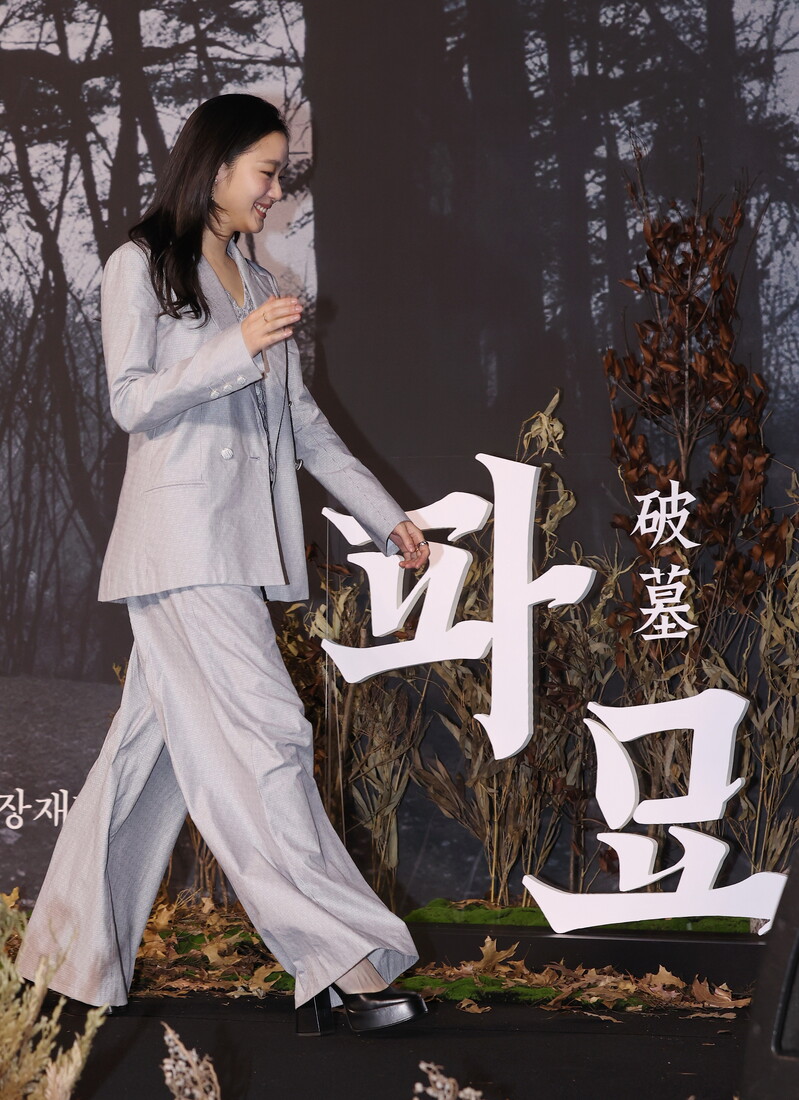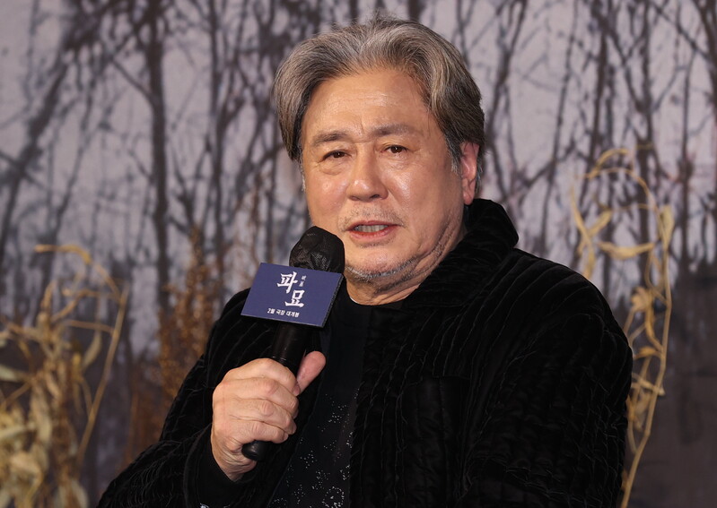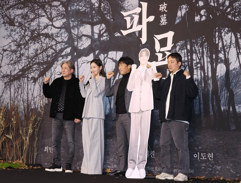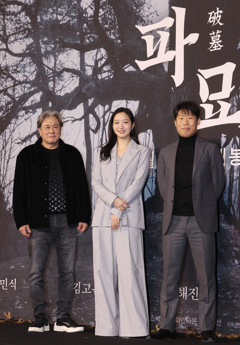 The stars of the new movie "Exhuma" Choi Min-sik, Kim Go-eun and Yoo Hae-jin along with director Jang Jae-hyun, attend a publicity event in Seoul on Jan. 17, 2024. The movie will be released in South Korea in February.