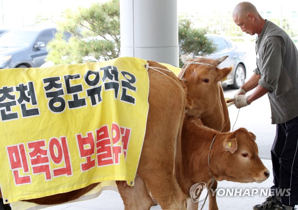 | ▲ "레고랜드 짓지 마소" (춘천=연합뉴스) 지난해 5월 6일 오전 강원 춘천시 강원도의회 앞에서 열린 레고랜드 컨벤션센터 부지 매입안 통과 저지 기자회견에 소를 몰고 참석한 농민이 건립 반대를 촉구하는 펼침막을 소 등 위에 걸고 있다. [연합뉴스 자료사진] |