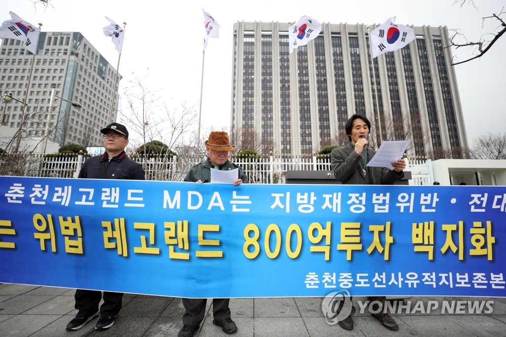 | ▲ 청사 앞 춘천 레고랜드 800억 투자 백지화 요구 (서울=연합뉴스) 2019년 3월 21일 오전 정부서울청사 앞에서 춘천중도선사유적지보존본부 관계자들이 기자회견을 열고 정부 측에 강원도 춘천 레고랜드 관련 투자 백지화를 요구하고 있다. [연합뉴스 자료사진] |