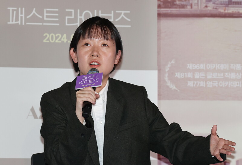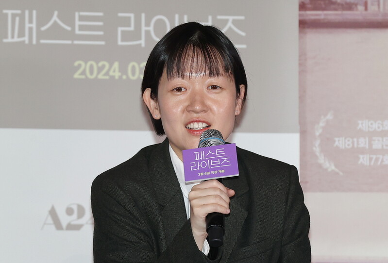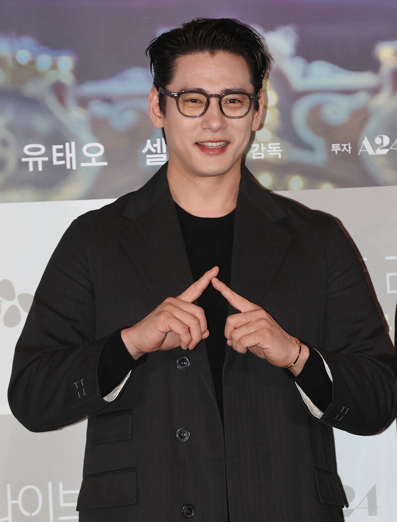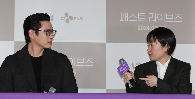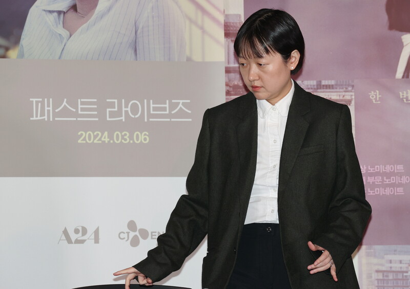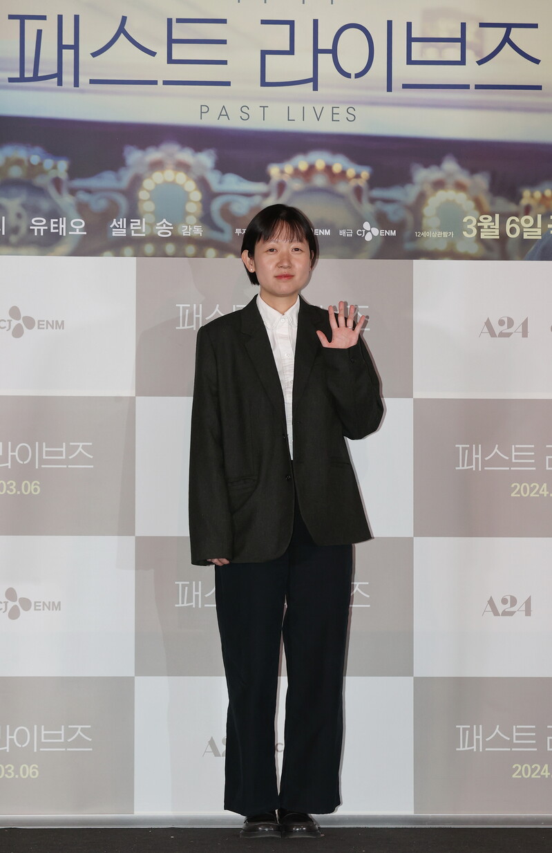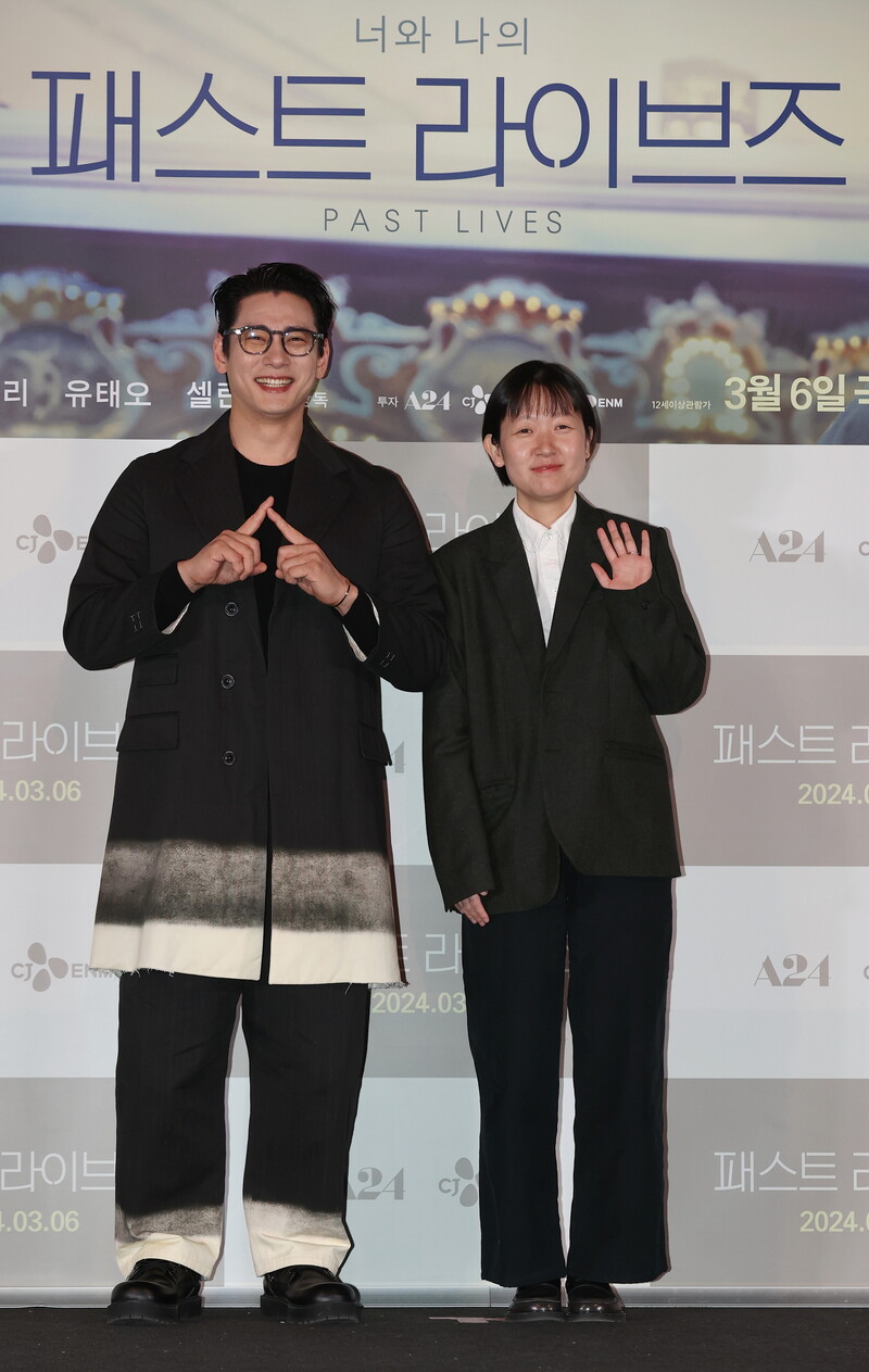 South Korean actor Yoo Teo who stars in the new movie "Past Lives," attends a publicity event along with director Celine Song in Seoul on Feb. 28, 2024. The movie will be released in South Korea on March 6. (Yonhap)