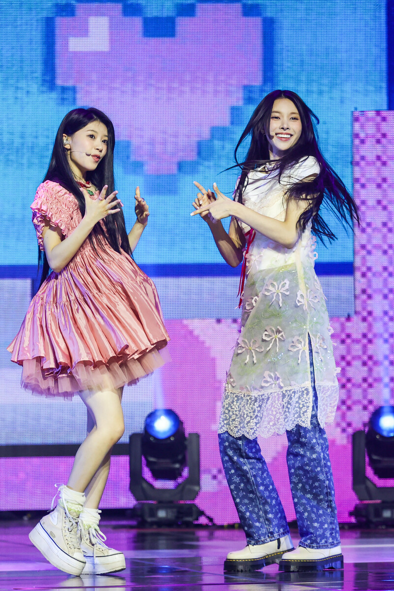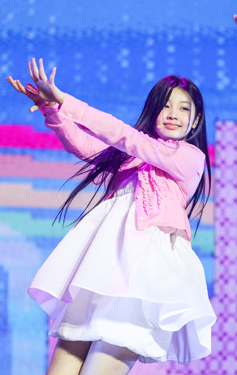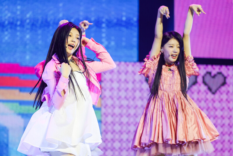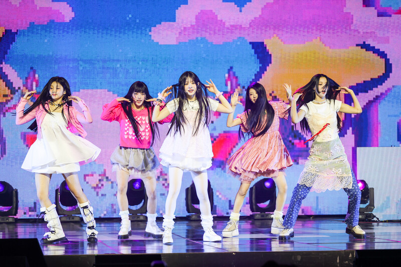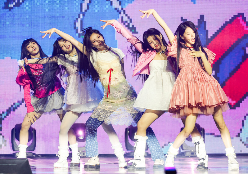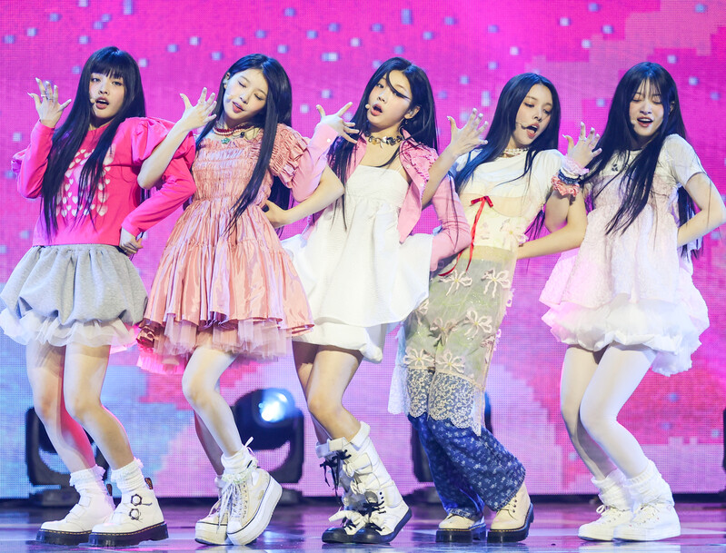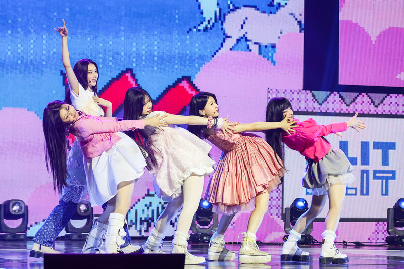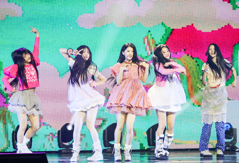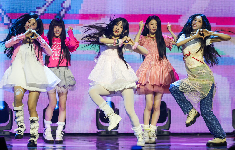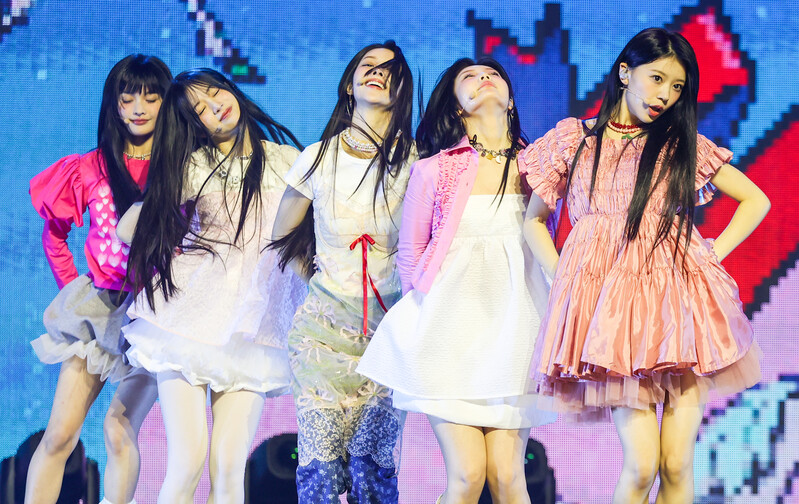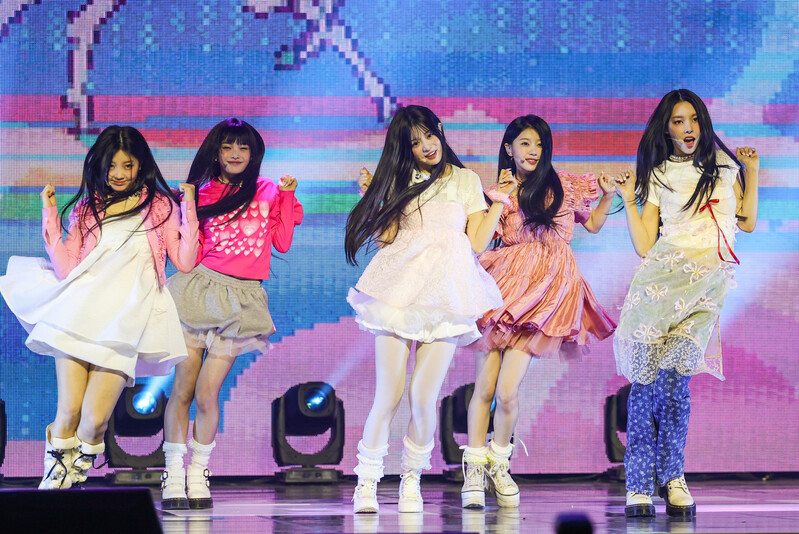 South Korean girl group ILLIT performs during a showcase for the group's debut album "Super Real Me" with title song "Magnetic" in Seoul on March 25, 2024.