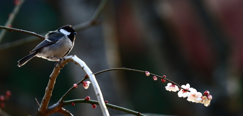 What is the Great Tit thinking about looking at plum blossoms blooming at Tongdosa Temple, a historic Buddhist temple in Yangsan, Gyeongsangnam-do, S. Korea?