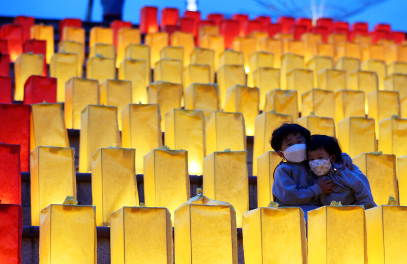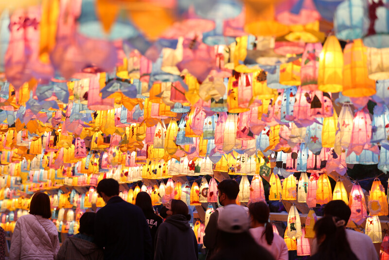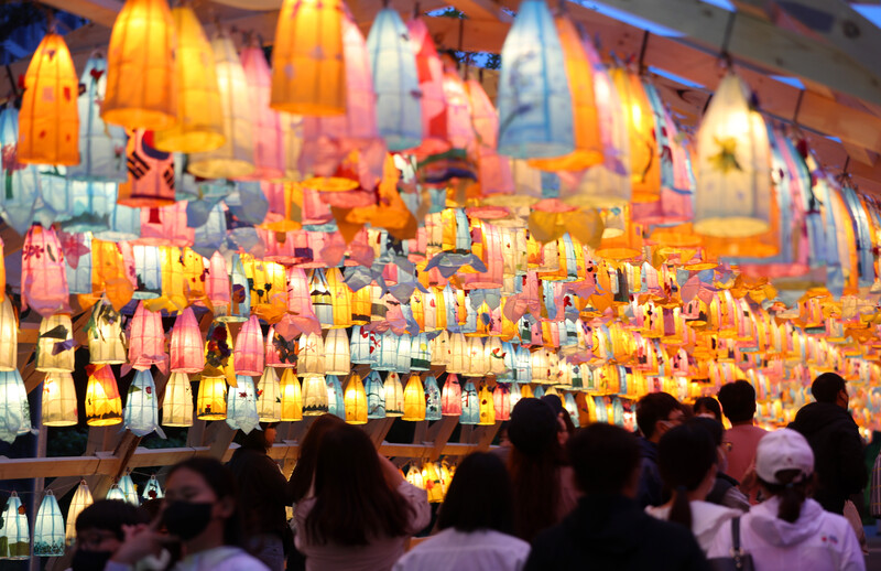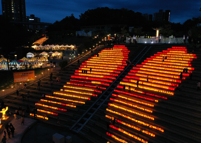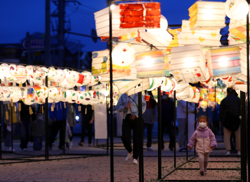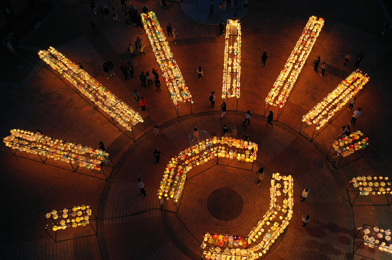 These photos taken May 8, 2022, show lit paper lanterns during a festival on traditional Korean paper at a theme park in Wonju, Gangwon Province, northeastern South Korea. The festival, which opened May 5, will run through May 15. (Yonhap)