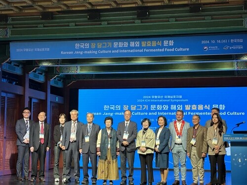 ▲ Attendees take a commemorative photo at the "2024 International Symposium on Intangible Heritage" held at Korea House in Jung-gu, Seoul,on October 16, 2024. Hosted by the National Heritage Promotion Agency, the symposium discussed Korea’s traditional jang culture and international fermented food practices. (Yonhap) |