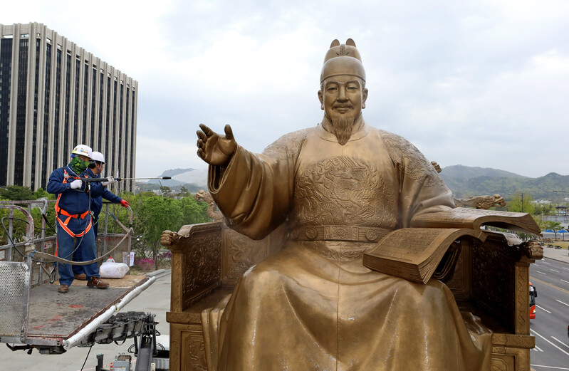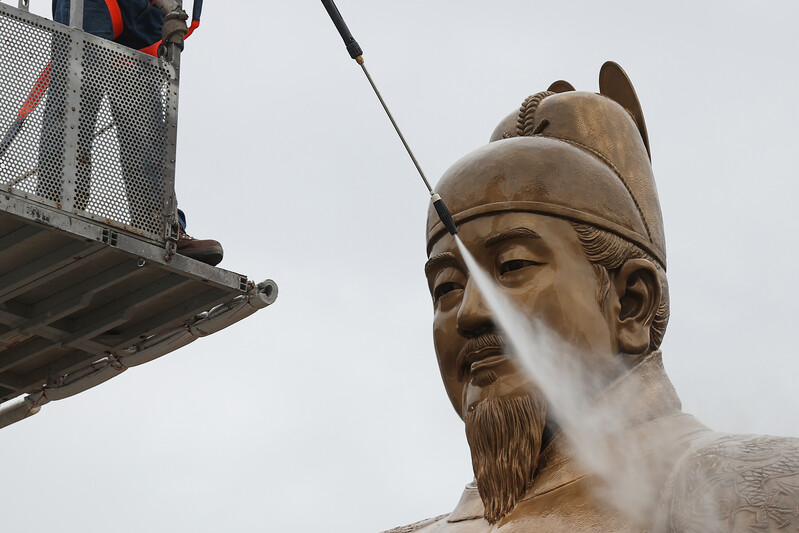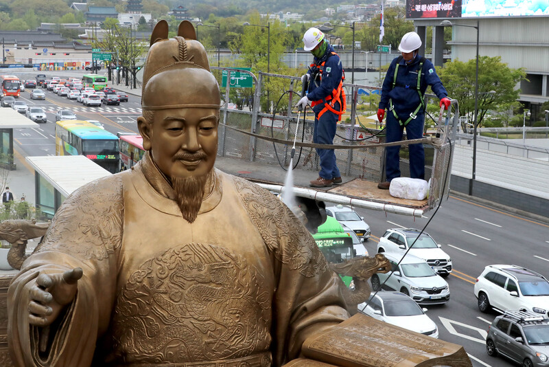 Workers spray water on the statue of King Sejong at Gwanghwamun Square in central Seoul on April 15, 2023, to remove dirt as part of springtime cleanup. Sejong, the fourth king of the Joseon Dynasty (1392-1910), created the Korean alphabet Hangeul in 1446. (Yonhap)