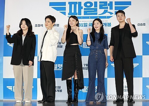 | ▲ The lead cast for upcoming film "Pilot" pose for photos at the film's press conference held in Seoul on June 26, 2024. (Yonhap) |