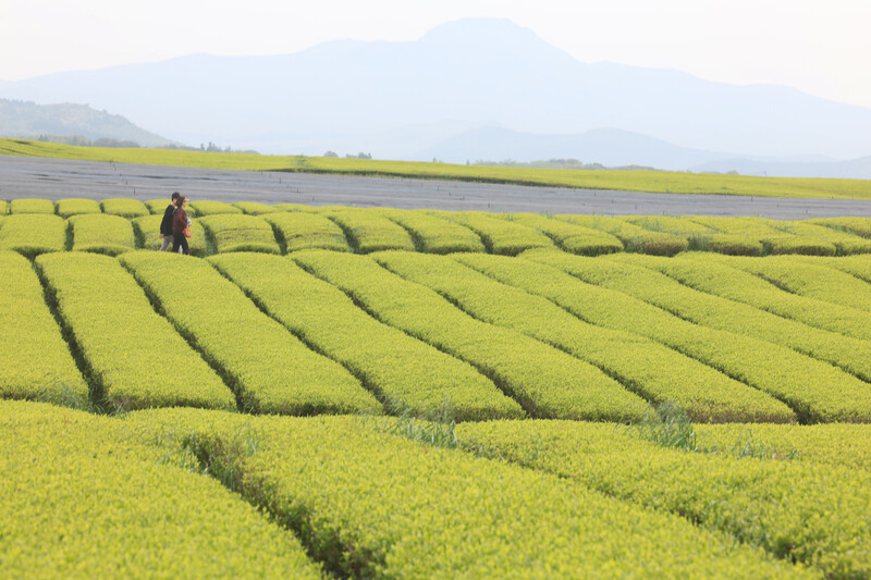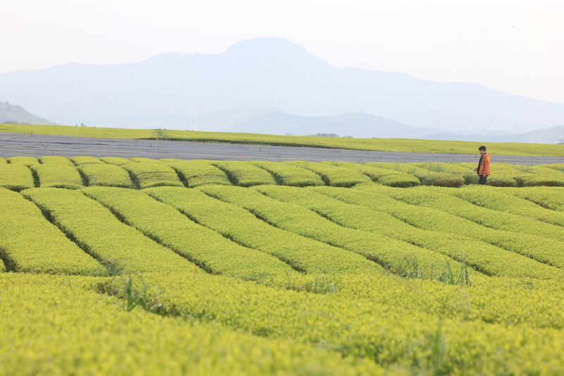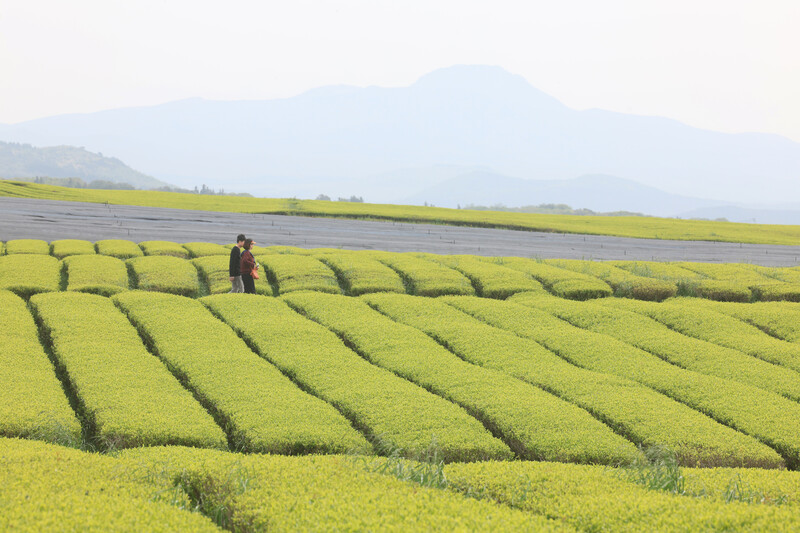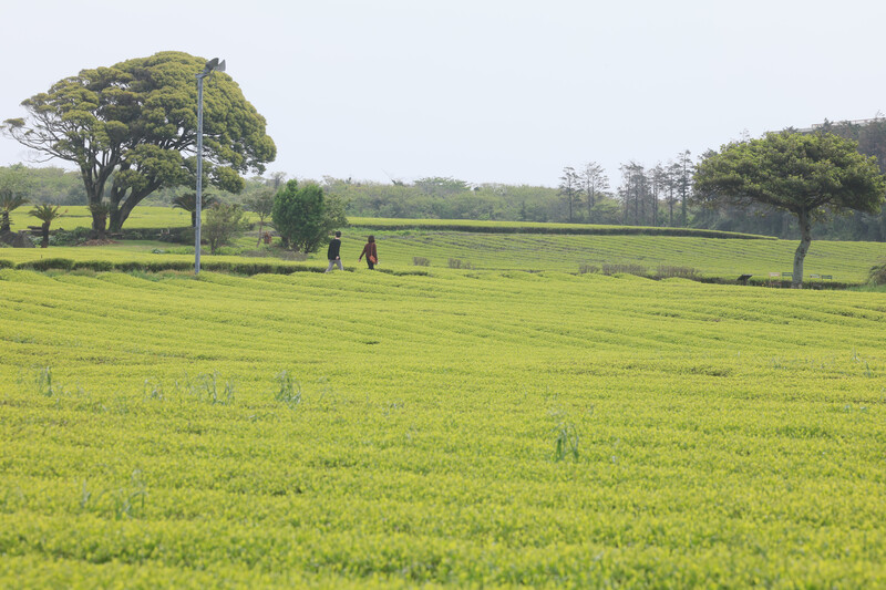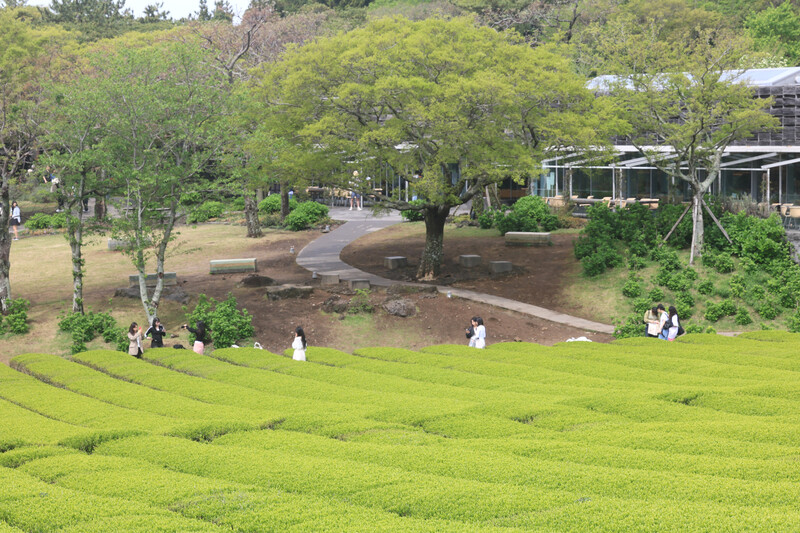 Visitors walk through a green tea field on South Korea's southern island of Jeju on April 19, 2023. (Yonhap)
