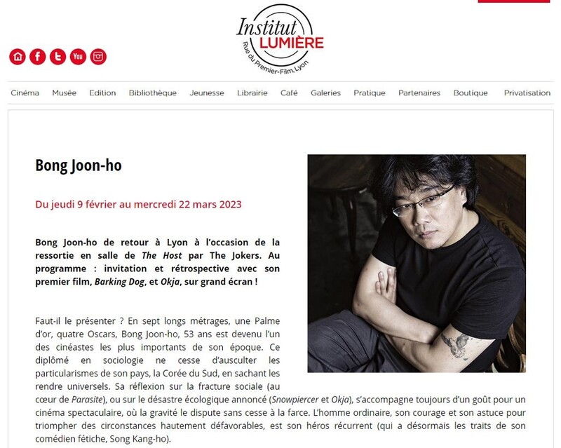 | ▲This photo captured from the official webpage of Institut Lumiere show description of director Bong Joon-ho. (PHOTO NOT FOR SALE) (Yonhap) |