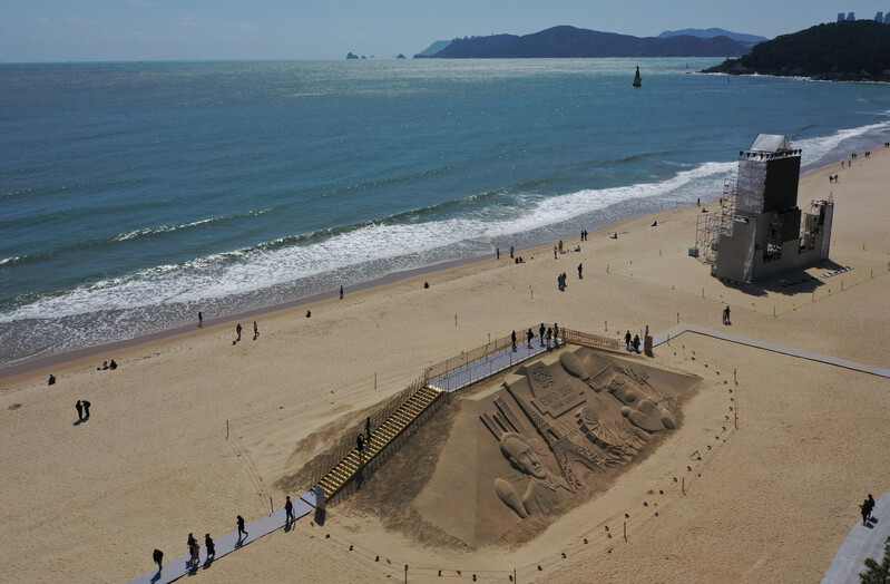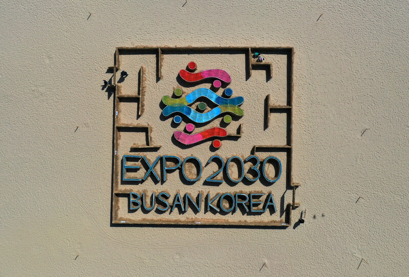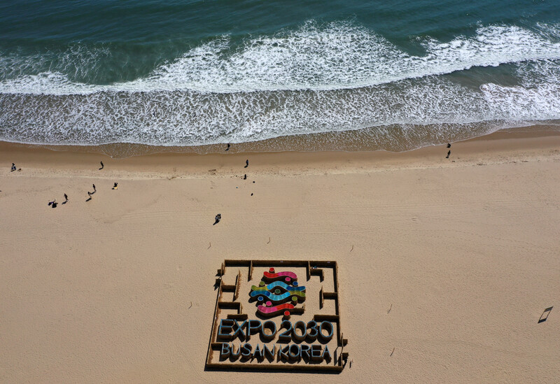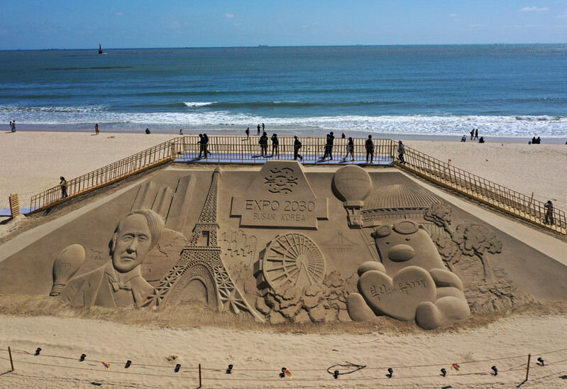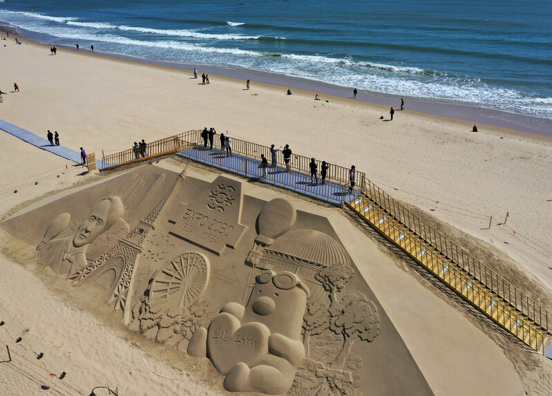 This photos, taken on April 3, 2023, show a sand sculpture bearing the image of the 2030 World Expo in the South Korean port city of Busan on the city's Haeundae Beach. An inspection team from the Bureau International des Expositions' (BIE) is set to inspect the city starting the next day, as South Korea has been bidding to host the event in Busan. (Yonhap)