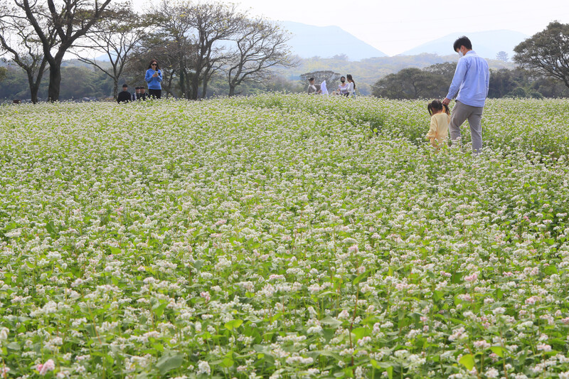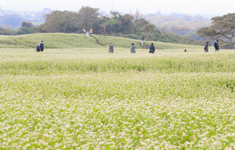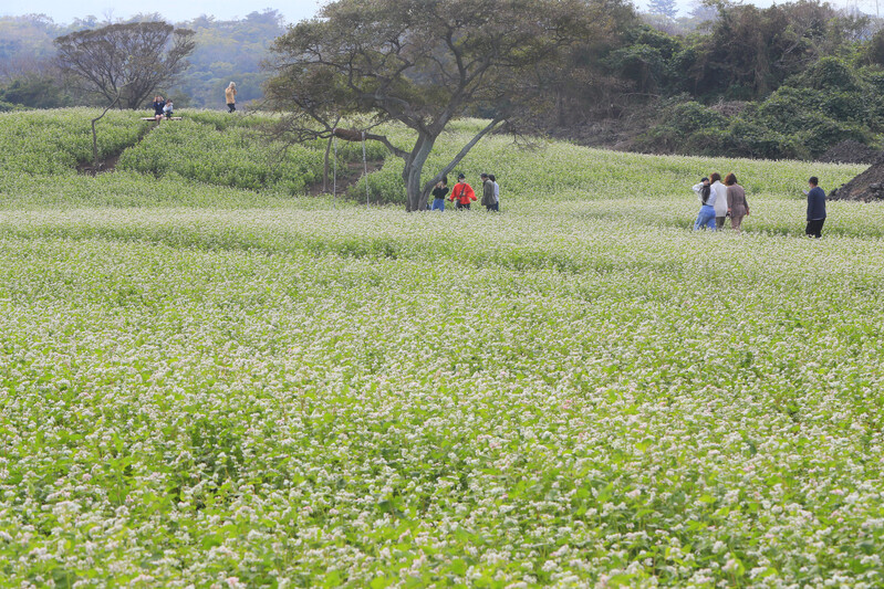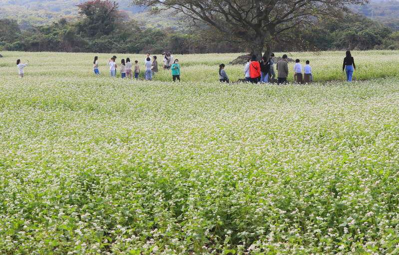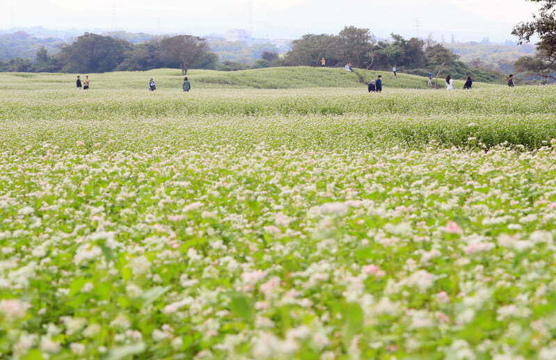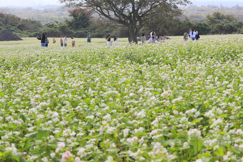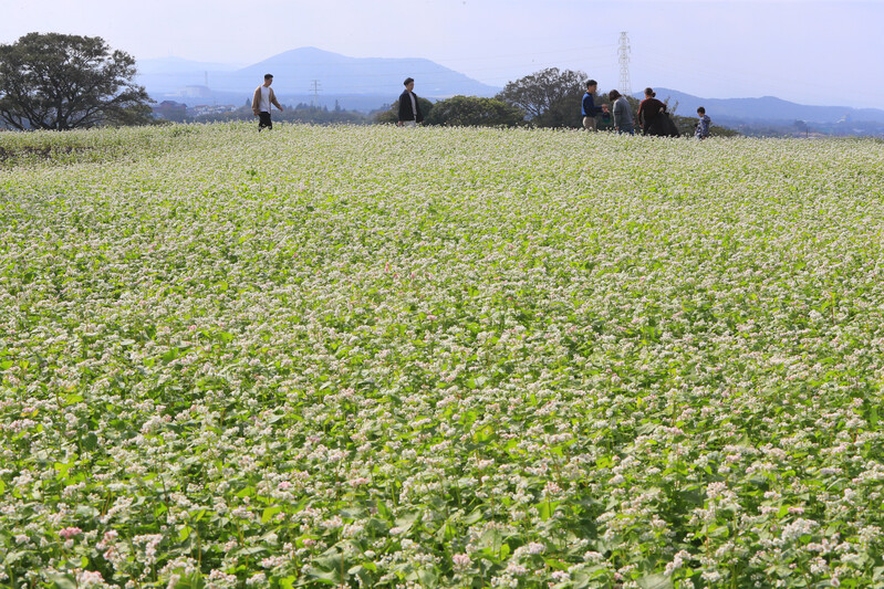 People enjoy buckwheat flowers in full bloom on South Korea's southern resort island of Jeju on Oct. 23, 2022. (Yonhap)