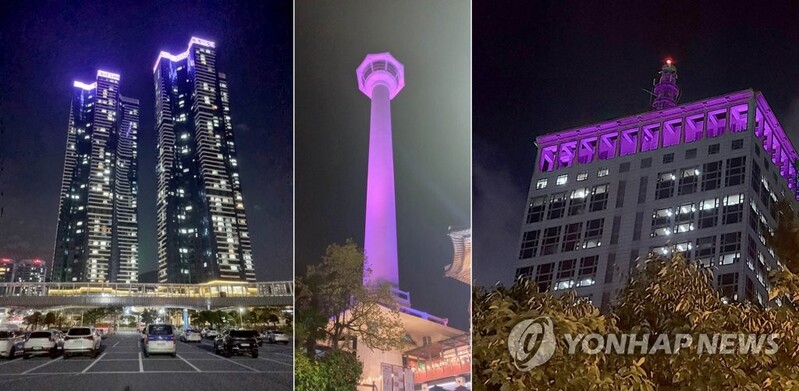 | ▲This photo shows, Busan's tourist spots illuminating in purple. (Yonhap) |