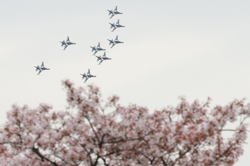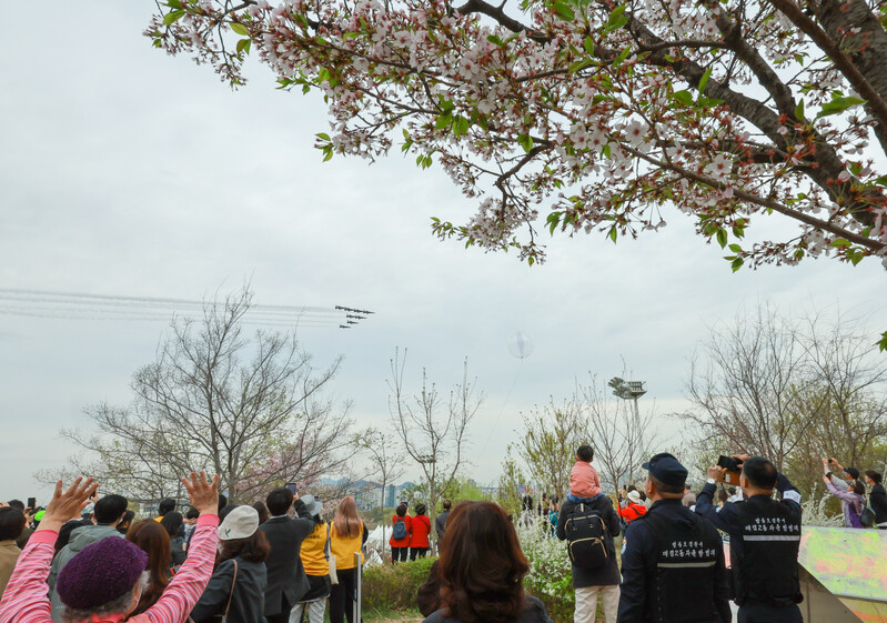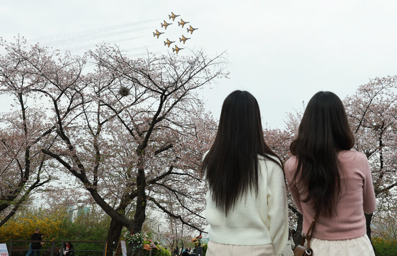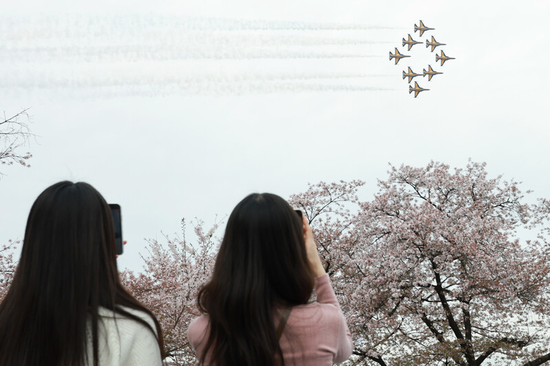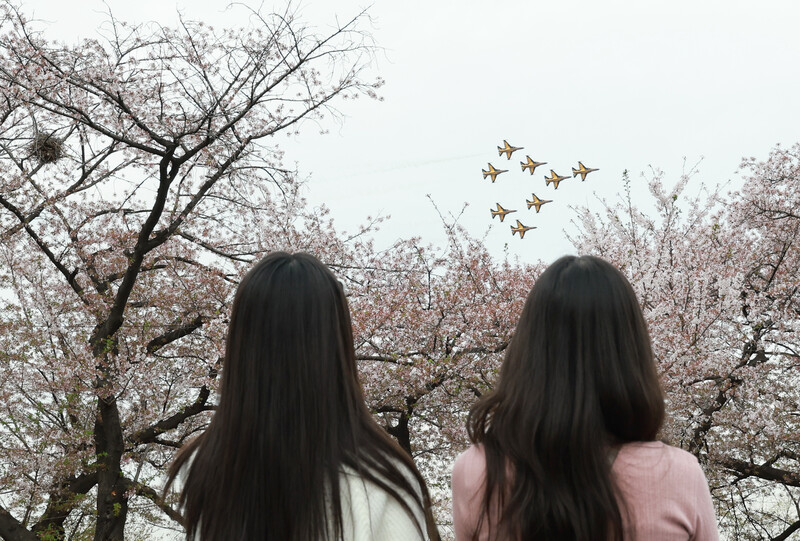 The Air Forces' Black Eagles aerobatic flight team performs over the Yunjungno street during the annual cherry blossom festival in the Yeouido area of Seoul's Yeongdeungpo Ward, a famous spot for viewing cherry blossoms, on April 4, 2023. (Yonhap)