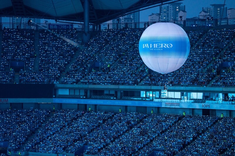 Despite the overcast skies, Lim Young-woong's concert at Sangam World Cup Stadium glowed with a clear, blue hue. The heavy rain that poured before the concert eased just in time to celebrate the Hero Era's festival.