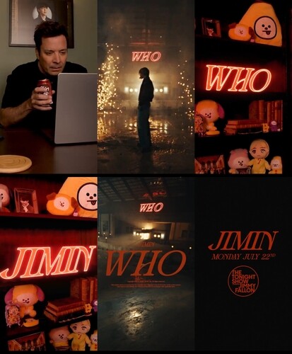 On the 18th, 'The Tonight Show' teased Jimin's appearance through their official social media channels, sharing a video clip. The teaser features Jimmy Fallon drinking from a can labeled 'Dr. Jimin' while watching Jimin's performance on his laptop, followed by a brief glimpse of the stage, heightening anticipation.