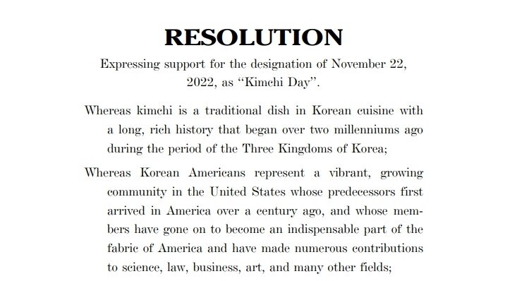 This resolution, dedicated to celebrate positive example, Kimchi, of cultural exchange between Korea and U.S, was submitted last July, but the house of representative has not yet made a schedule to handle it