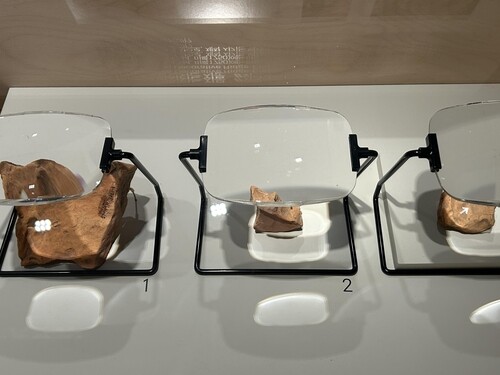 ▲ This photo, taken on Oct. 21, 2024, shows chimi fragments excavated from Mireuksaji are exhibited at the National Iksan Museum in Iksan, North Jeolla Province. The photo shows fragments with visible fingerprints. (PHOTO NOT FOR SALE) (Yonhap) |