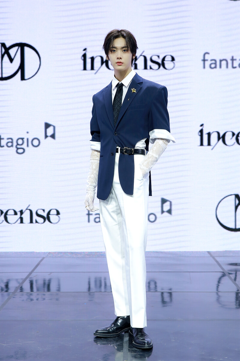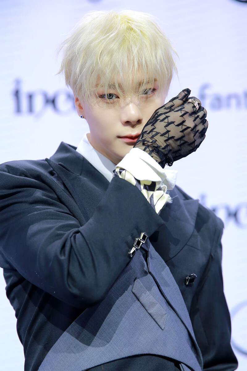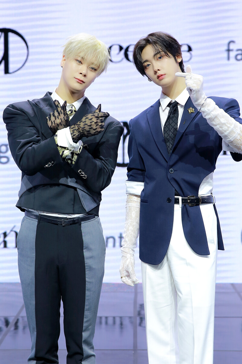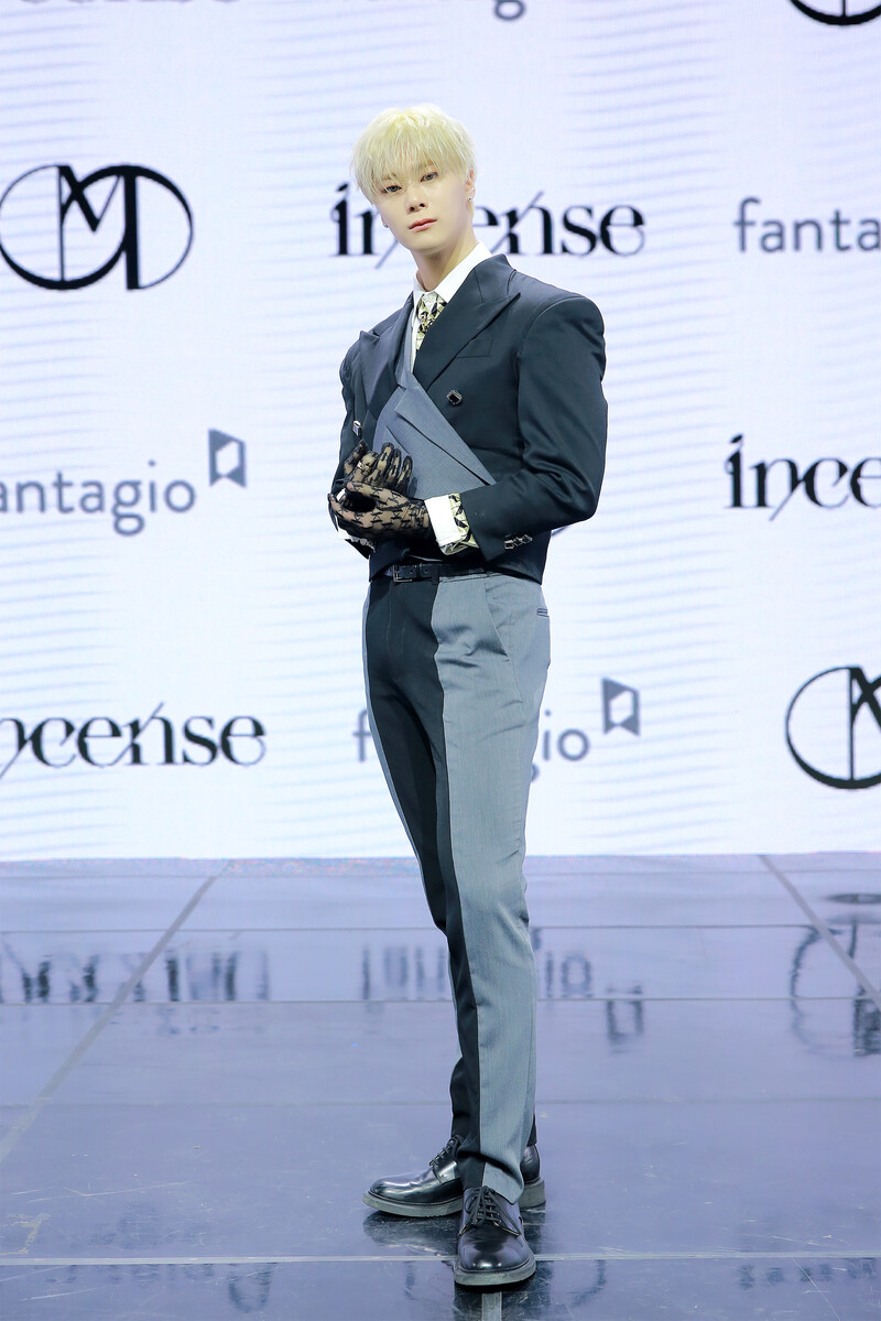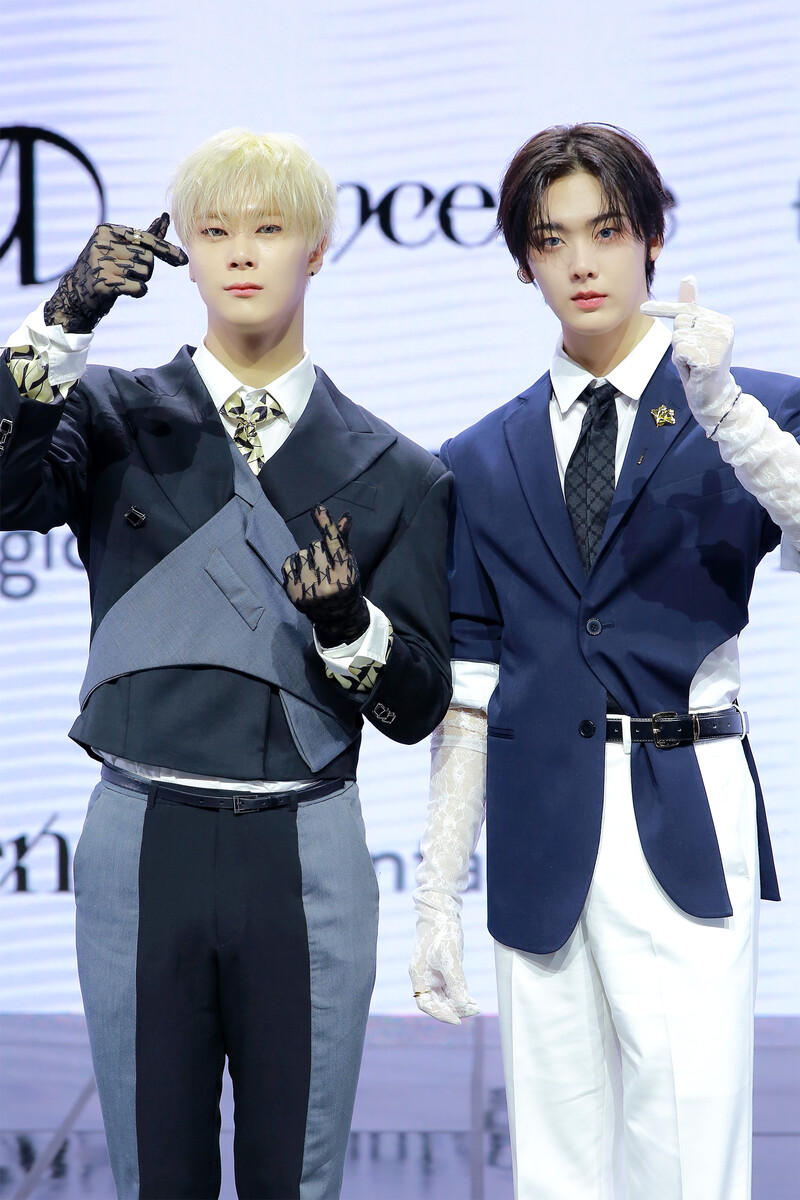 These photos, provided by Fantagio, shows Moonbin and Sanha posing during photo time at the media showcase held for their third mini album "INCENSE."