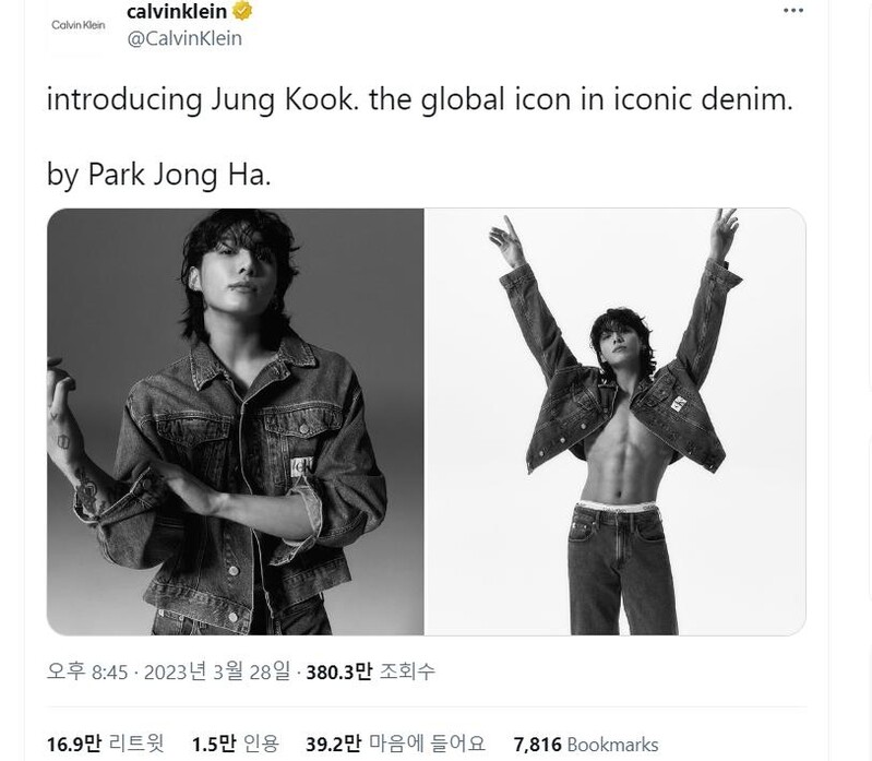 Calvin Klein addressed through their official twitter account on March 29 (US Time) “Introducing JungKook the global icon in iconic denim.” showcasing photos of Jung Kook with Calvin Klein’s products.