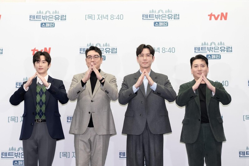 Actors Cho Jin-woong, Choi Won-young, Park Myung-hoon, and Kwon Yul, who left for Spain with a backpack, have attended the production presentation of tvN's variety show "Europe Outside Your Tent" held at the Stanford Hotel in Sangam-gu, Seoul on Thursday.