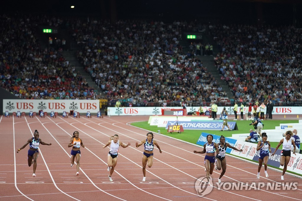 | ▲ 톰프슨, 오늘도 1등 (취리히 EPA=연합뉴스) 일레인 톰프슨(오른쪽 네 번째)이 10일(한국시간) 스위스 취리히에서 열린 세계육상연맹 다이아몬드리그 여자 100m 경기에서 가장 먼저 결승선을 통과하고 있다. |