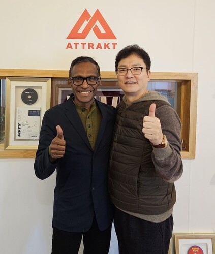 | ▲ This photo, provided by Attrakt on Aug. 22,2024, shows Shridhar Subramaniam, President of Sony Music Entertainment Asia & Middle East (L), and Jeon Hong-jun, CEO of Attrakt, giving a thumbs-up. (PHOTO NOT FOR SALE) (Yonhap) |