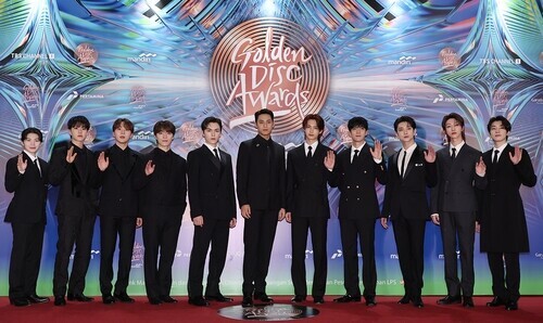 | ▲ K-pop boy group Seventeen poses for photographers at the 38th Golden Disc Awards ceremony in Jakarta on Jan. 6 |