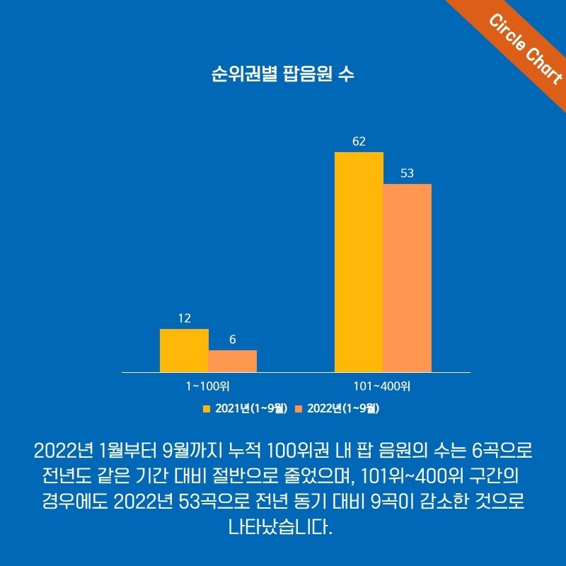 According to the lead researcher Kim Jin-woo of the Circle Chart on Tuesday, starting from January until September of 2022 pop consumption has been accounted 22 percent per month, at this rate consumption rate of pop music will be able to hit lowest point, even lower than its record in 2017, 19.6 percent.