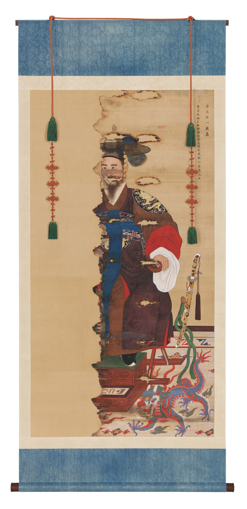 Moreover, the Portrait of King Cheoljong, the only late-Joseon painting that shows the king in military attire, is displayed in the exhibition together with related artifacts, such as military uniform, commander's club, waist band, thumb ring, and sword. Together they allow a visualization of the king as commander-in-chief.