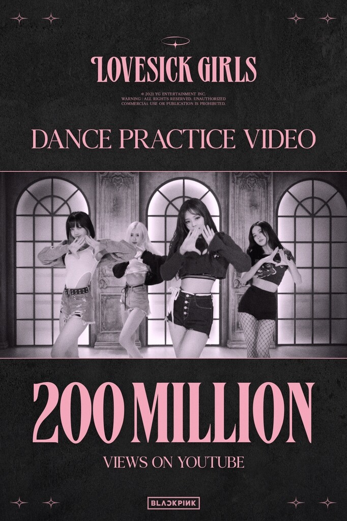 | ▲ This image, provided by YG Entertainment on Oct. 19, 2021, marks 200 million YouTube views for K-pop act BLACKPINK's dance practice video "Lovesick Girls." (PHOTO NOT FOR SALE) (Yonhap) |