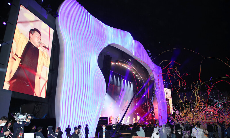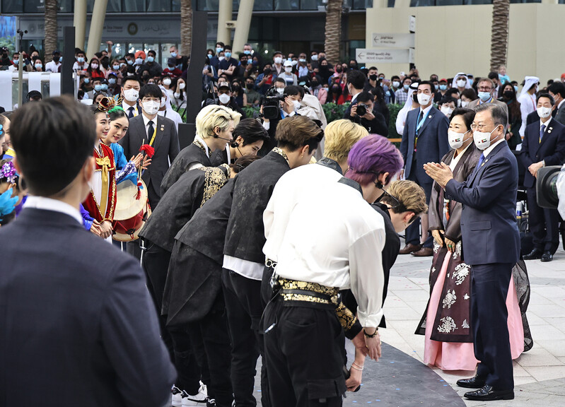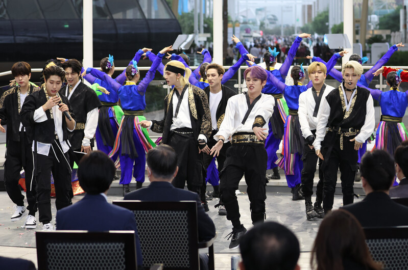 These photos show K-pop boy group Stray Kids and S. Korean singer PSY, who perform at Expo 2020 Dubai for “Korea’s National Day” ceremony.