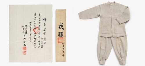 | ▲ This photo provided by the Korea Heritage Service (KHS) shows the certificate of designation (left) and work uniform (right) of late dancheong master Hong Jeom-seok. (PHOTO NOT FOR SALE) (Yonhap) |