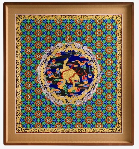 The exhibition opens with a survey of Hong’s diverse works, bringing together pieces he displayed in previous heritage holder exhibitions, including “Blue Dragon and White Tiger Dancheong Pattern,” “Dae‑ryangcho Dancheong Pattern,” “Gold Dancheong Hyeonmu‑do,” and a “Replica of Dancheong at Tongdosa Temple in Yangsan.”