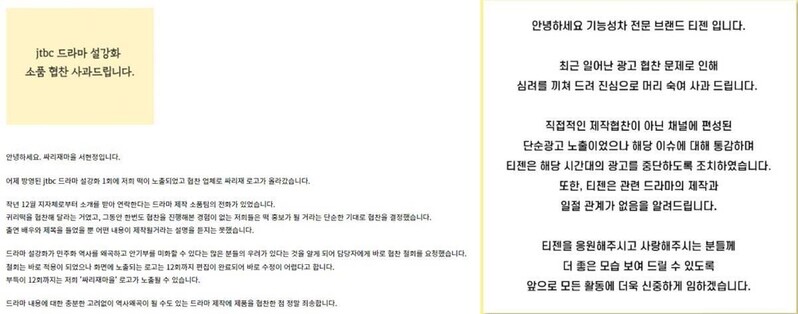 "We sincerely apologize for the recent issue about our sponsorship. Although our sponsorship was a mere exposing of our product not a production made for the series, we have rearranged to stop advertising during that period," said functional tea brand Teazen on the 20th through its website.