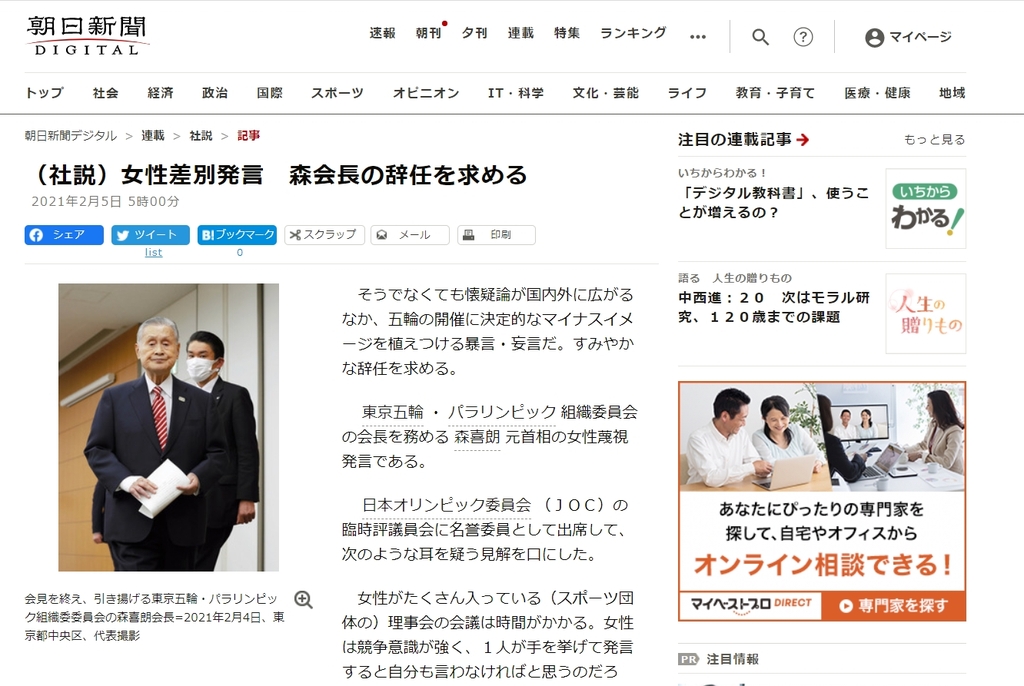| ▲ (도쿄=연합뉴스) 여성 차별 발언을 한 모리 요시로 2020도쿄올림픽·패럴림픽 조직위원장의 사퇴를 주장하는 아사히신문 5일 자 사설. [아사히신문 해당 웹페이지 갈무리] |