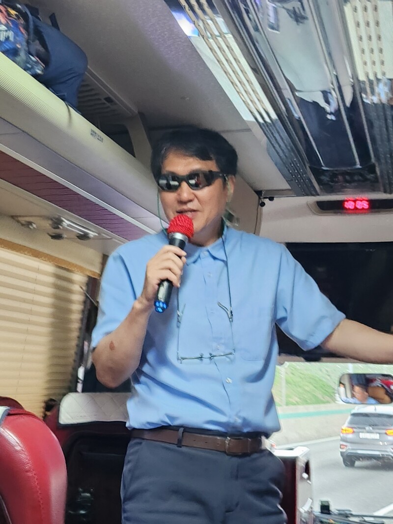 | ▲버스안에서 열강하시는 도광환 국장. Team leader Do Gwang-hwan gives lectures during a bus ride. |