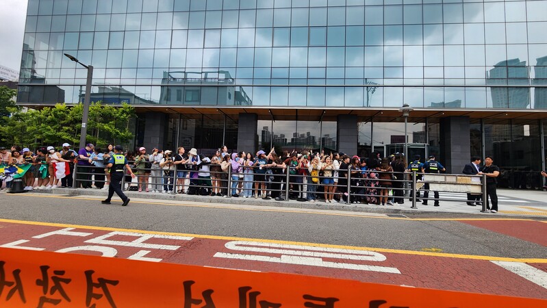 ARMY, the official fan club of K-pop superband BTS, gathers in front of the Seoul headquarters of Hybe in Yongsan on June 10, 2025, with the banner "We Are Back," to celebrate the military discharge of BTS' RM and V. Photo courtesy of ARMY. (PHOTO NOT FOR SALE) (Yonhap)