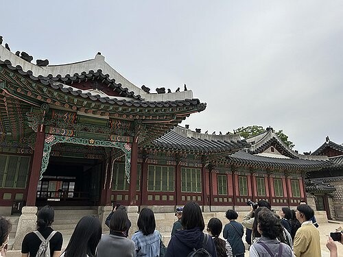| ▲ Visitors to the “Wake Up the Morning Palace” event at Changdeokgung Palace in Seoul on May 6, 2024, take photos while listening to an explanation about Huijeongdang Hall. (Yonhap) |